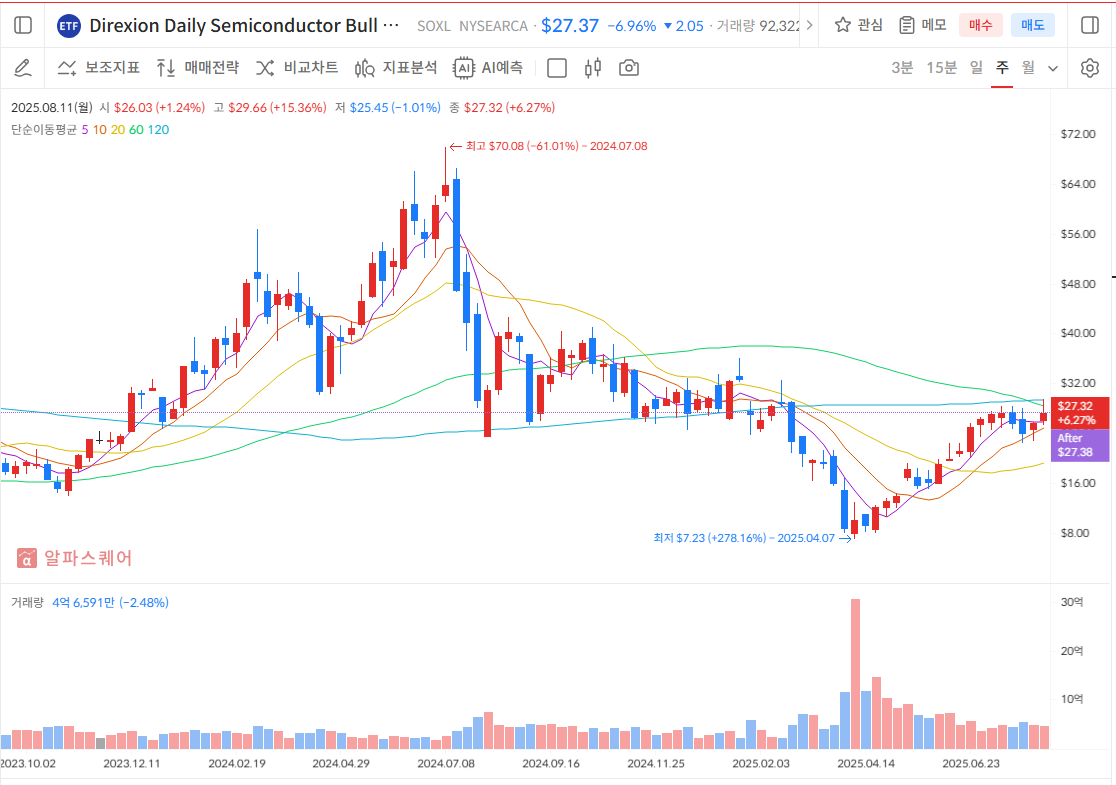 여기서 한발 더 나아가, 반도체 시장의 상승세에 대한 확신이 있다면 SOXL은 수익을 극대화할 수 있는 매우 매력적인 투자 수단입니다. SOXL은 ICE 반도체 지수의 일일 등락률을 3배로 추종하는 레버리지 ETF입니다.