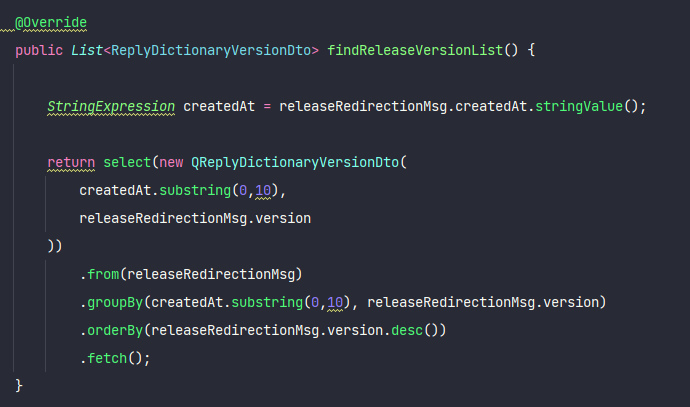 간단하게 설명드리면 해당 테이블에서 등록일자와 버전정보를 groupBy 해서 가져오는 쿼리를 querydsl 로 구현한내용입니다.