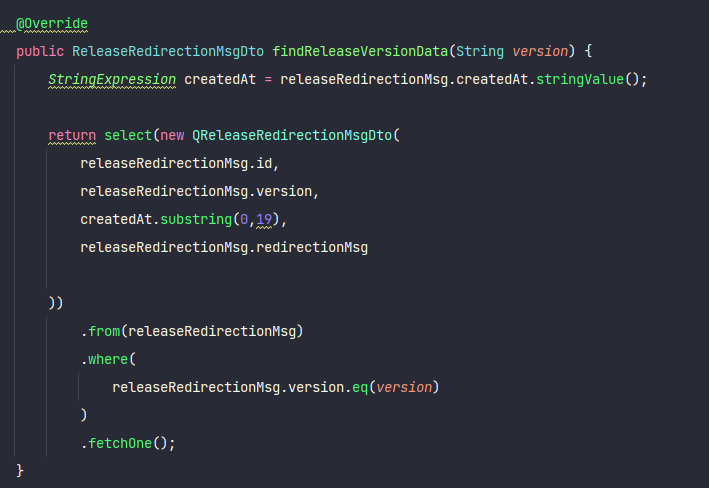 2) fetchOne관련 간단하게 설명드리면, 해당 테이블에서 id, 버전정보, 등록일자, 메시지를 가져오는 쿼리를 querydsl로 구현한 내용입니다.