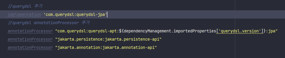 그리고, Querydsl 를 사용하기 위해서는 만약 gradle 을 사용한다면, build.gradle 에 아래 의존성을 설정해줘야 합니다.