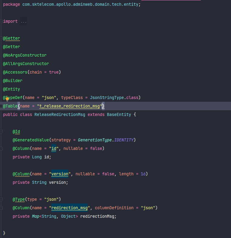 해당 테이블의 entity입니다. (참고로, jpa buddy를 사용해서 entity를 만들었습니다..)